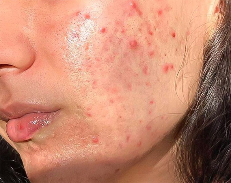 • Mụn viêm: Là các loại mụn ở thể nặng, có tổn thương viêm sâu dưới da kèm theo sưng đỏ, gây đau nhức và có mủ như mụn mủ, mụn bọc, mụn sưng viêm,… Với mụn viêm, bạn tuyệt đối không tự ý nặn mụn vì dễ làm ổ viêm lan rộng, nguy cơ nhiễm trùng tăng cao và dễ để lại sẹo rỗ trên mặt. Đặc biệt, nếu mụn xuất hiện ở những khu vực nhạy cảm như quanh miệng, cằm, mũi,… thì còn tiềm ẩn nhiều nguy cơ biến chứng khi thực hiện nặn mụn không đúng cách.